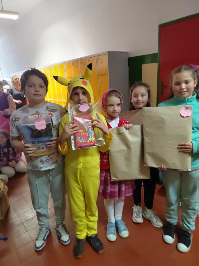 25 listopada 2025 r. obchodziliśmy Dzień Pluszowego Misia i Dzień Postaci z Bajek. Największy miś – Adasia z klasy II, najmniejszy – Martyny z klasy IV. Oboje otrzymali nagrody. Wręczono też wspaniałe nagrody za piękne prace plastyczne na temat bohaterów naszych bajek. Także uczniowie biorący udział w konkursie matecznym otrzymali ciekawe nagrody. Wystawę prac plastycznych można oglądać w bibliotece
